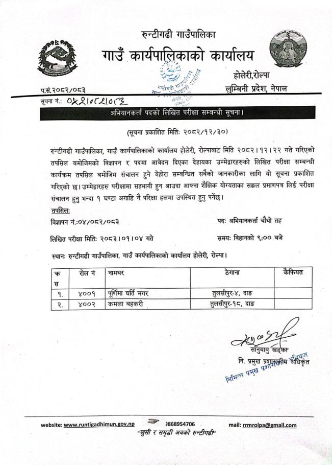 अभियानकर्ता पदको लिखित परिक्षा सम्बन्धी सूचना ।