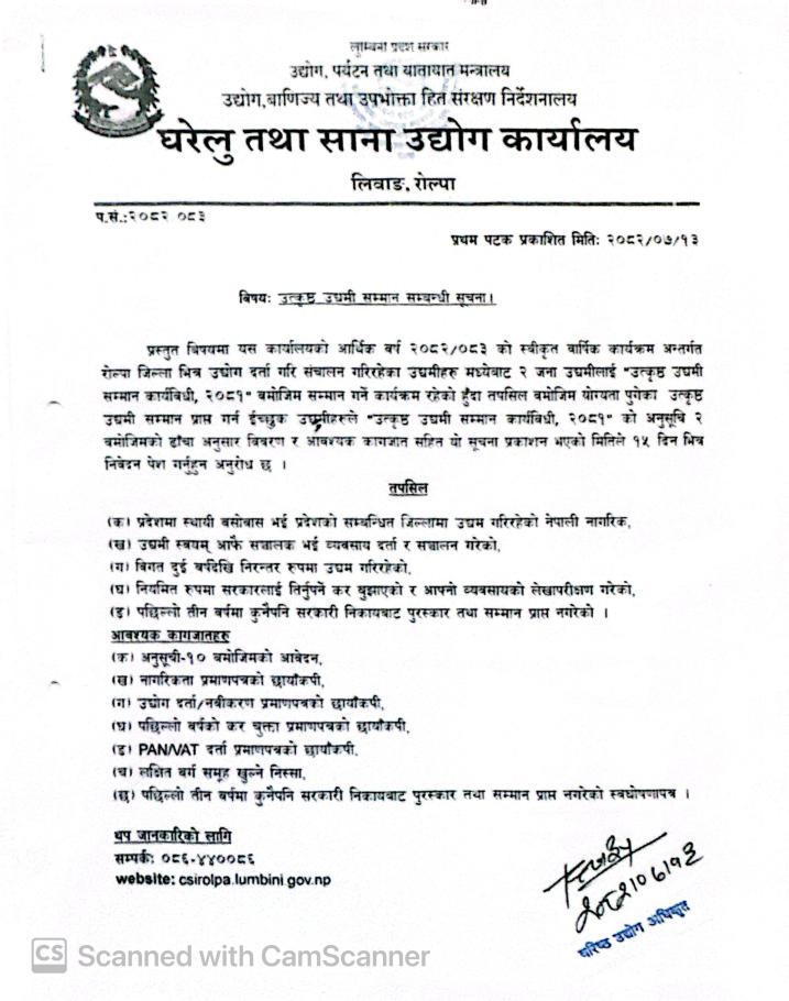» उतकृष्ठ उधमी सम्मान सम्बन्धि सूचना ।