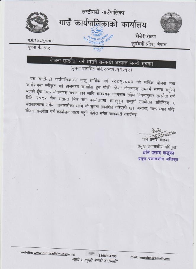 योजना सम्झौता गर्न आउने सम्बन्धी अत्यन्त जरुरी सूचना ।
