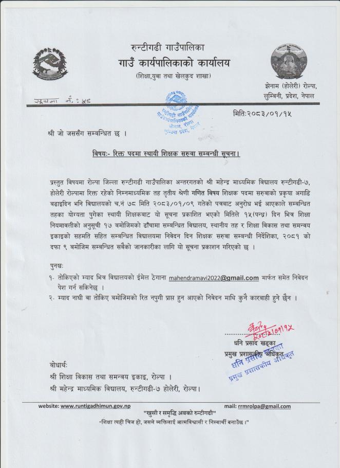 रिक्त पदमा स्थायी शिक्षक सरुवा सम्बन्धी सूचना ।