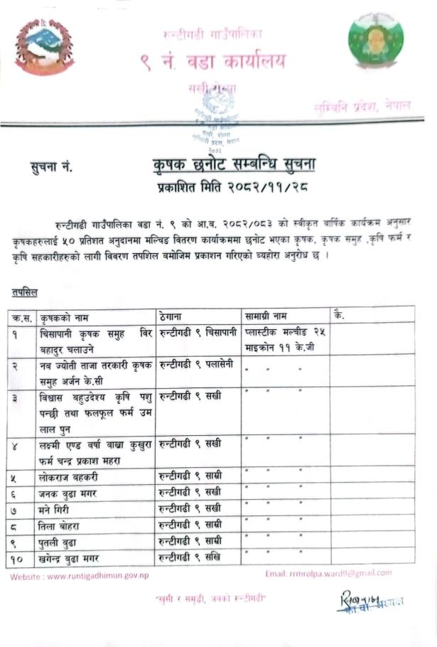 वडा नं. ९ को कृषिक छनोट सम्बन्धी सूचना ।