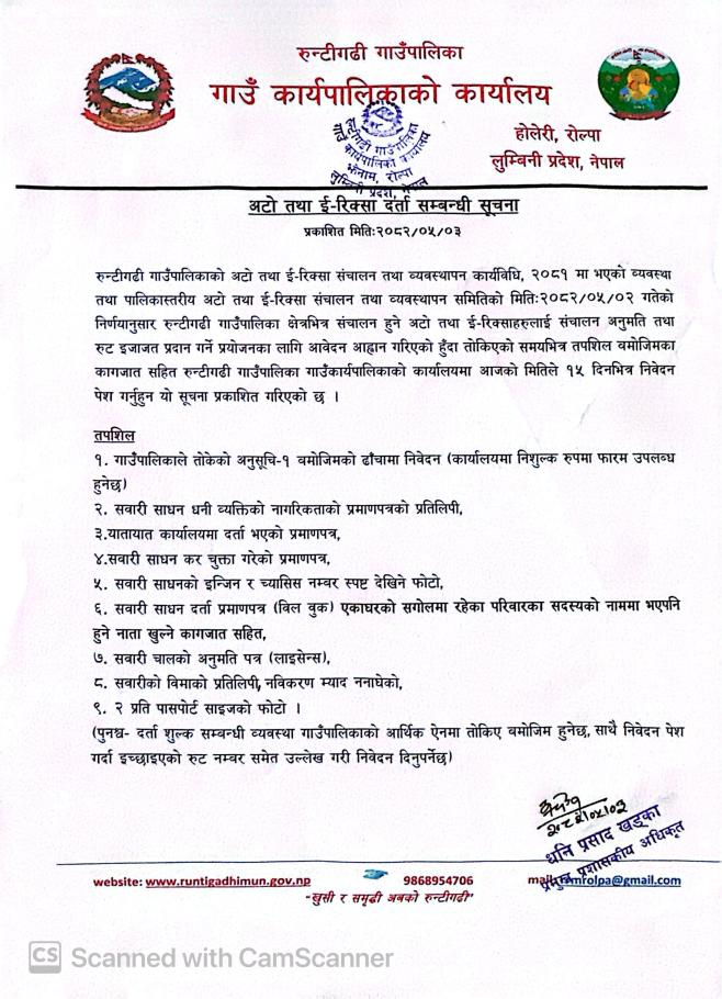 अटो तथा ई रिक्सा दर्ता सम्बन्धी सूचना ।