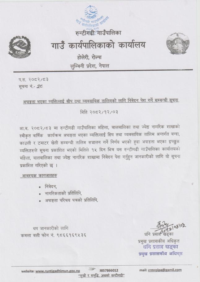 » अपाङ्गता भएका व्यक्तिलाई सिप तथा व्यवसायिक तालिमको लागि निवेदन पेश गर्ने सम्बन्धी सूचना ।