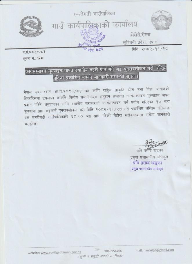 कार्यसम्पादन मूल्याङ्कन वापत स्थानीय तहले प्राप्त गर्ने अङ्क पुनरावलोकन गरी अन्तिम नतिजा प्रकाशित भएको जानकारी सम्बन्धी सूचना ।