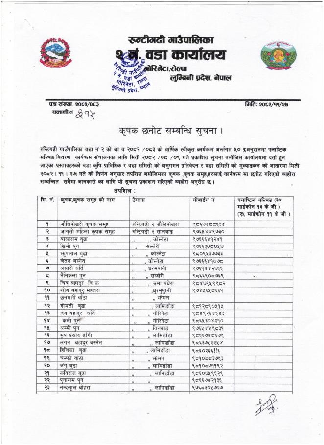 वडा नं. ९ को कृषिक छनोट सम्बन्धी सूचना ।