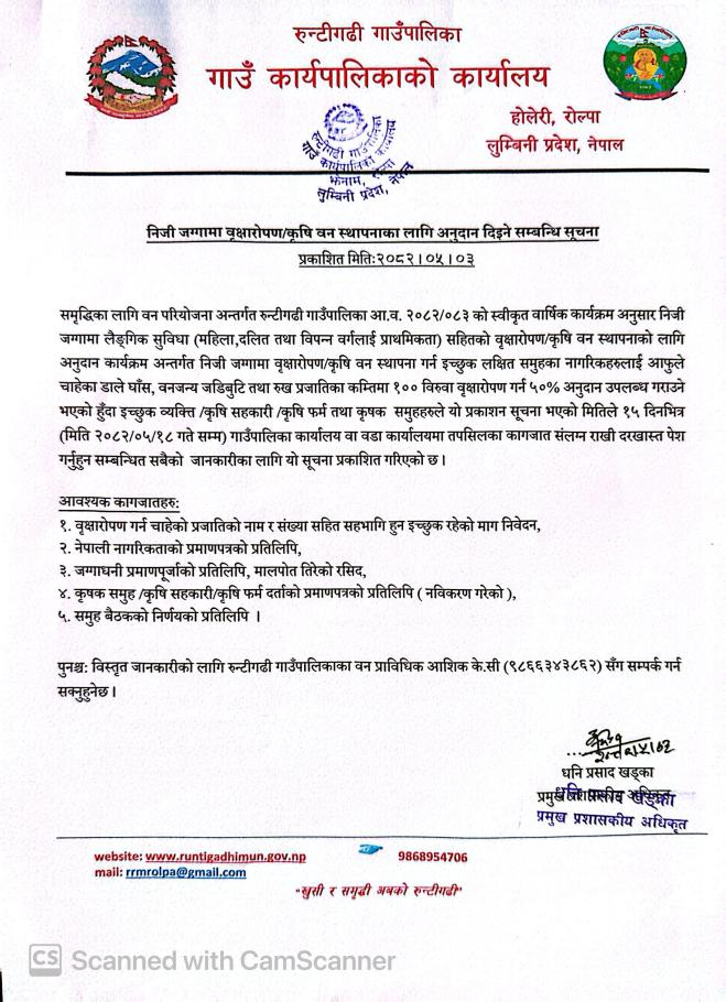 » निजी जग्गामा वृक्षारोपन/कृषि बन स्थापनाको लागि अनुदान दिईने सम्बन्धी सूचना ।